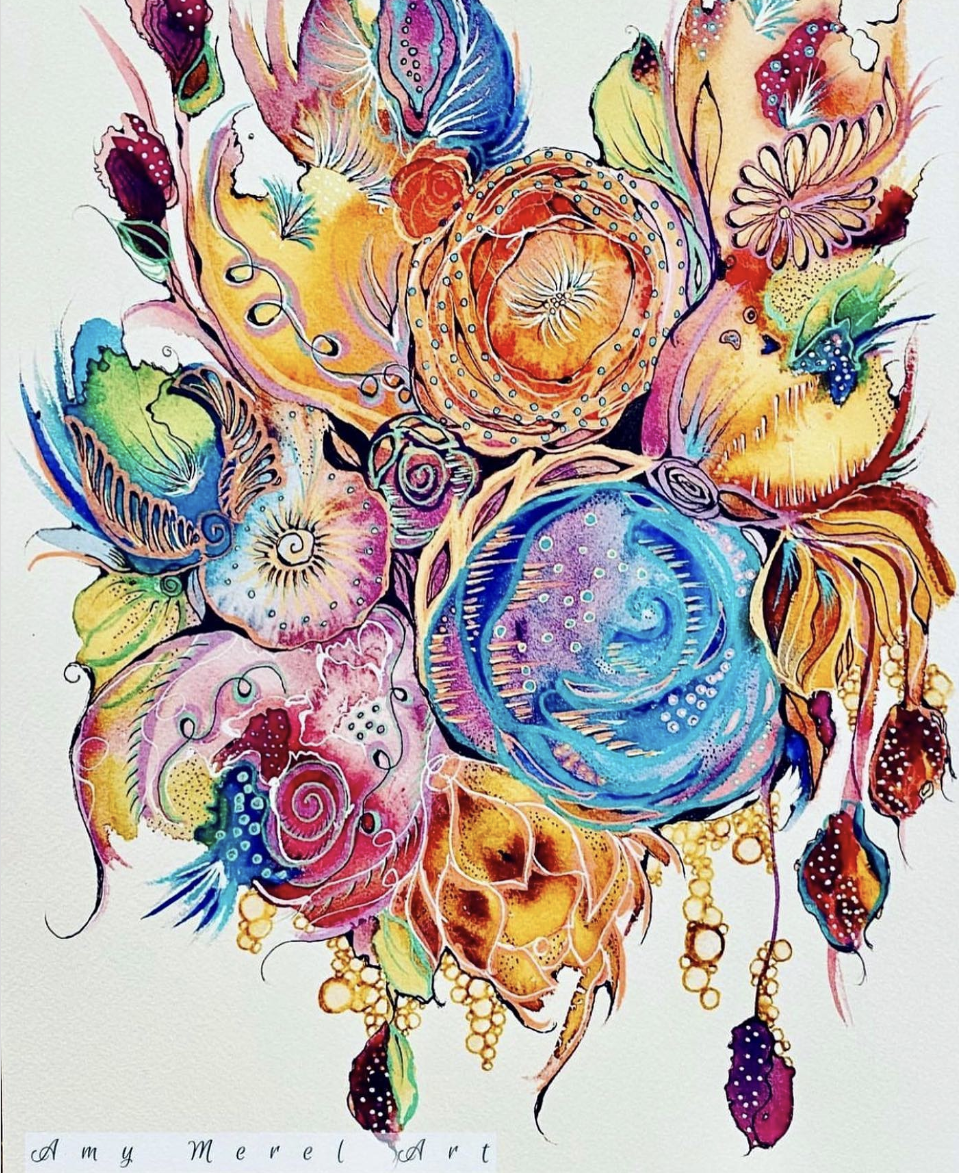 This watercolor, mixed media piece has so much going on. I feel like I could stare at it for hours. I love the lines, the dots, and how each bloom leads into the next in such a natural, organic way. It is a festive, energetic piece that reflects what is possible when you push the boundaries of watercolor painting. Amy has an Etsy site where she sells her paintings.