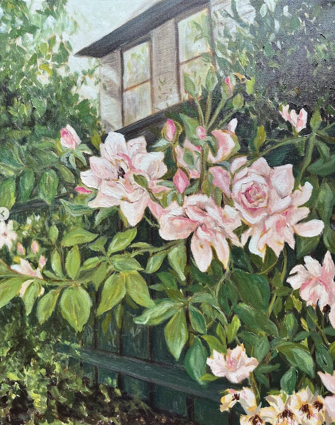 I love how this painting captures a scene from the garden. I can almost picture my self standing there, looking up at the house from among the beautiful blooms. The brush strokes and movement in this piece are a testament to Caitlin’s talent and what is possible when working with oils. Caitlin sells paintings and a variety of products on her website.
