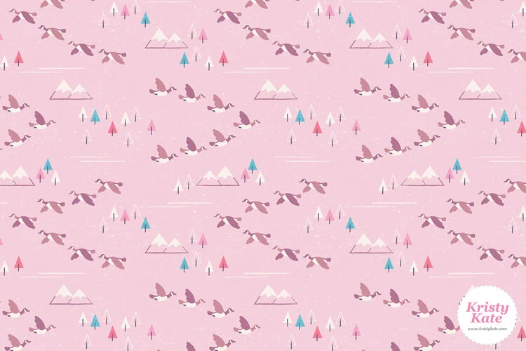 From there I repeated the arrow motif through the trees and mountains, and started exploring colour options. The pale pink colour palette was selected to represent snowy weather (minus the chill) and tie the design together as a cute pattern for children.